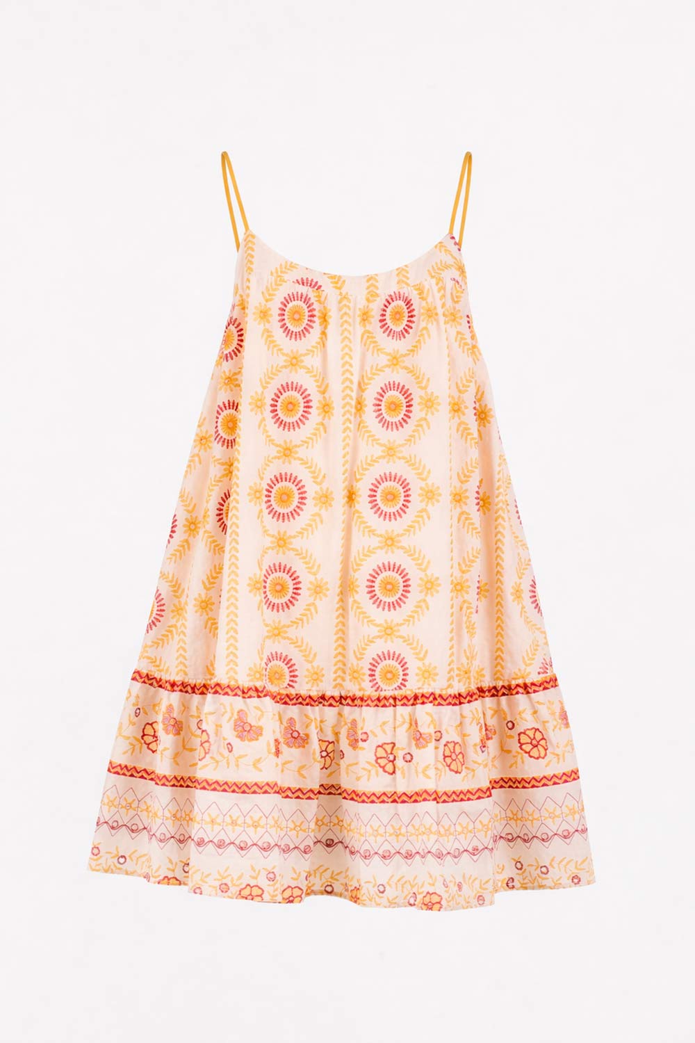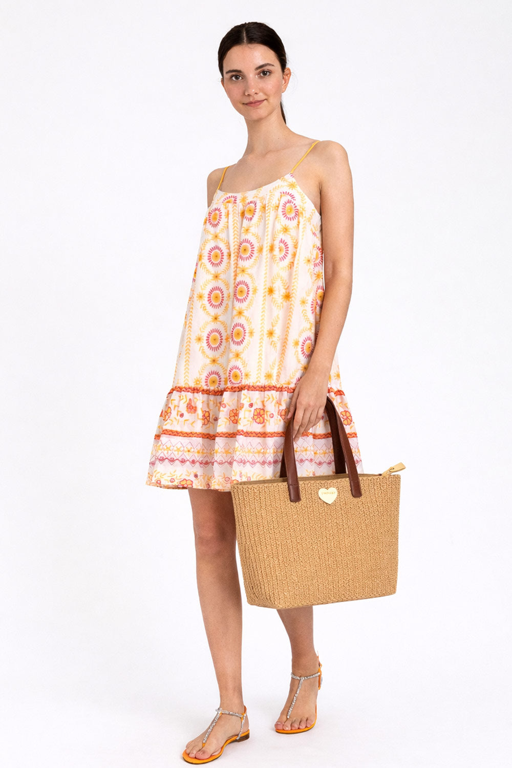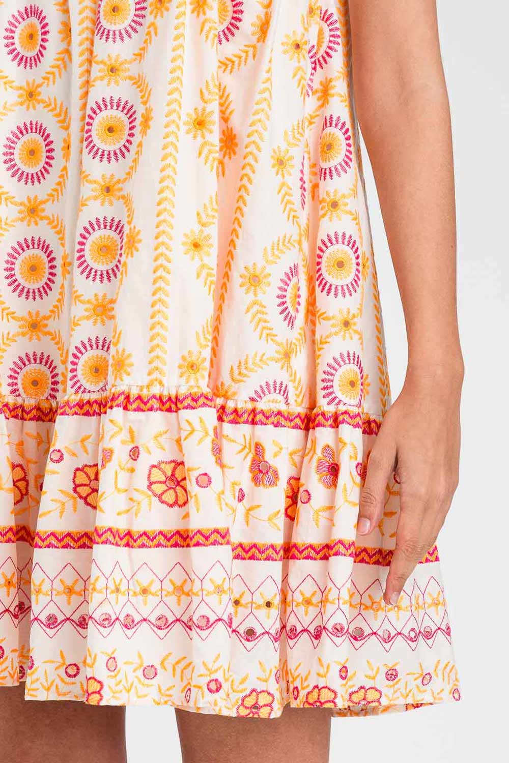 Abito corto Twinset in cotone ricamato, ideale per l’estate. Modello con spalline sottili regolabili, vestibilità morbida e balza decorativa. Ricami floreali e geometrici multicolor in stile boho chic. Perfetto con sandali per look freschi e femminili.