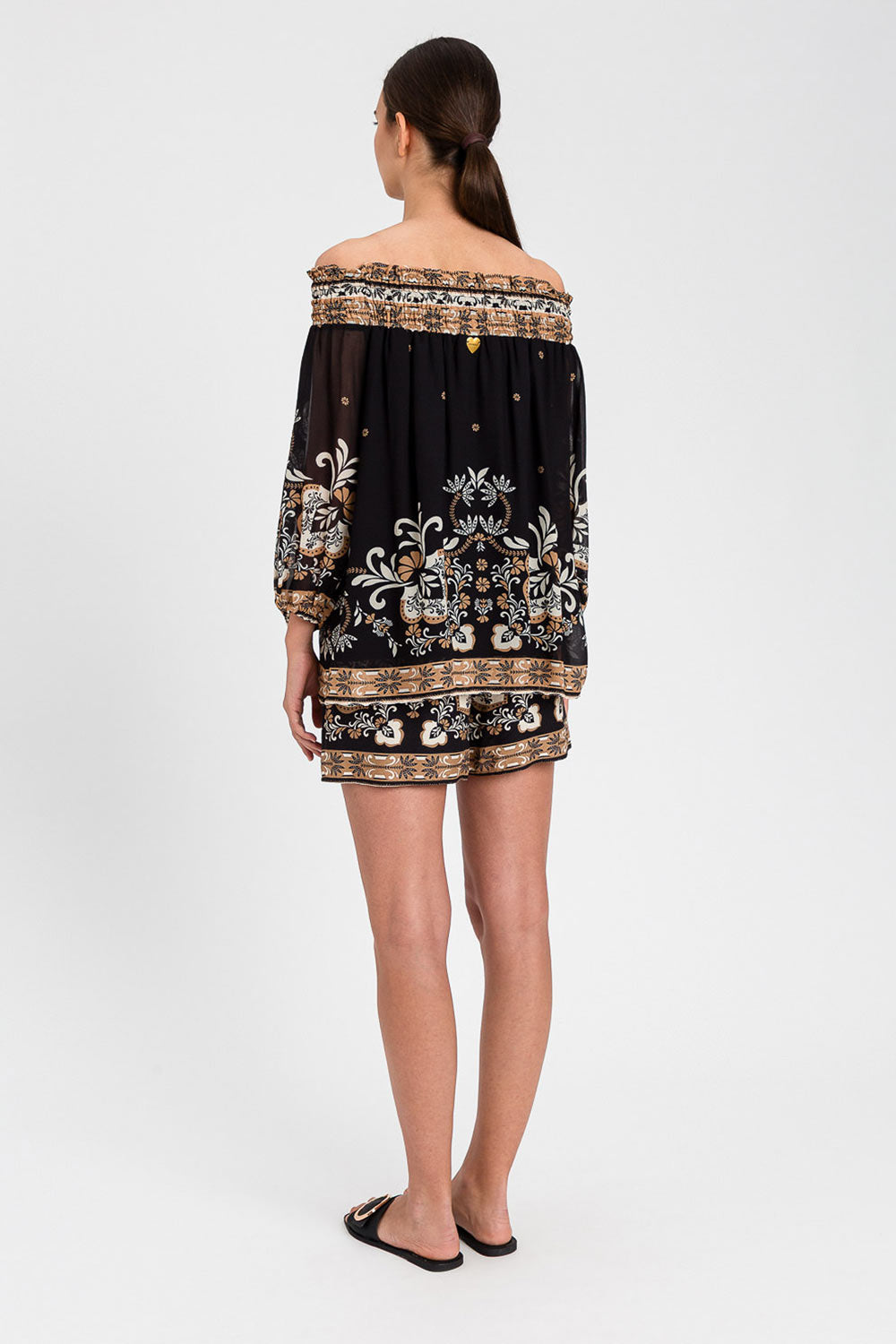 Blusa Twinset con stampa St. Foulard su fondo nero, arricchita da delicate nappine frontali. Il design fluido e femminile valorizza la silhouette, mentre il tessuto leggero garantisce comfort e movimento. Un capo elegante e versatile, ideale per look boho-chic raffinati.
