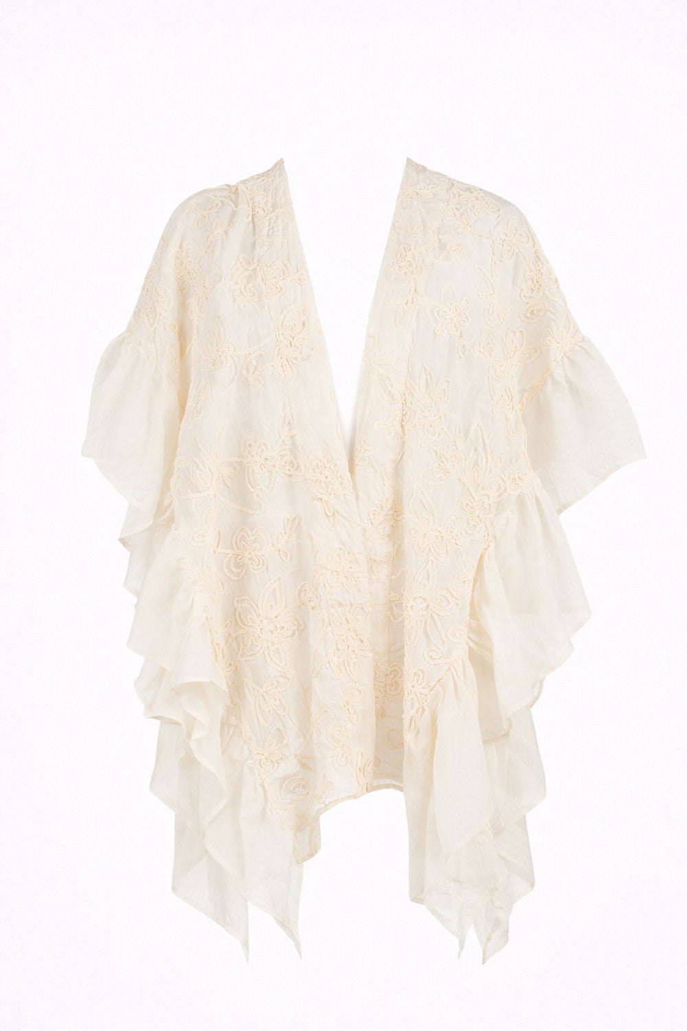Poncho kimono con raffinati ricami floreali color pergamena, realizzato in tessuto leggero e fluido. Le maniche ampie e la linea morbida donano eleganza e movimento, rendendolo il capo ideale per completare look estivi chic e sofisticati, dal giorno alla sera.